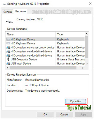 - Di jendela properties keyboard anda, alihkan ke tab Hardware kemudian klik Properties.
