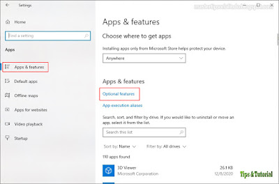 - Di jendela Settings, klik Apps di panel kiri dan di panel kanan klik Optional features.